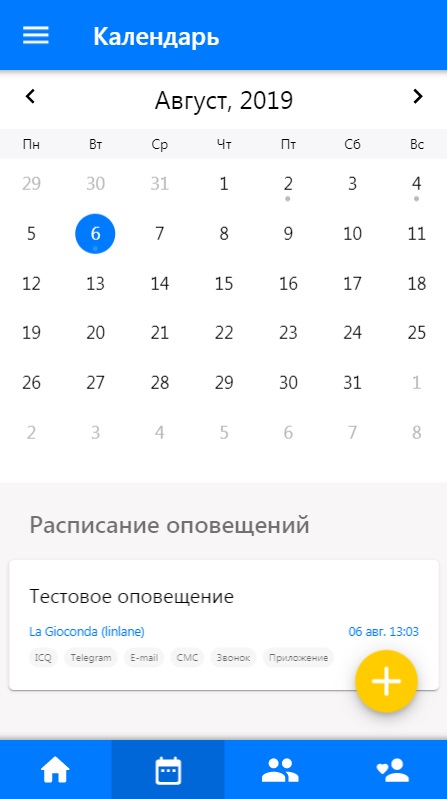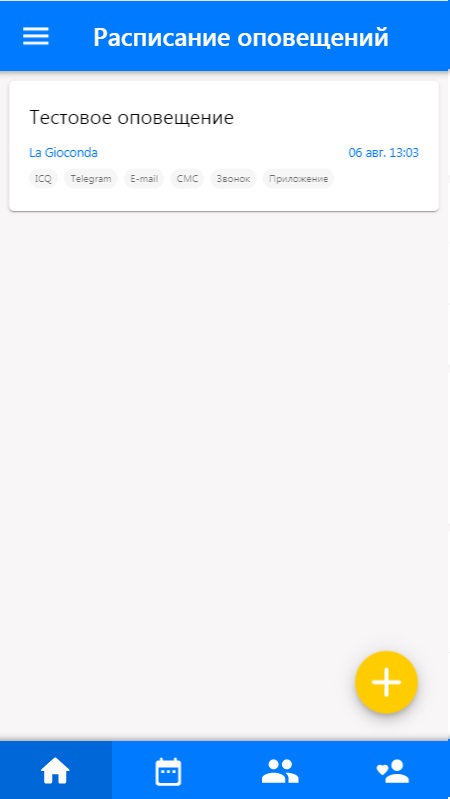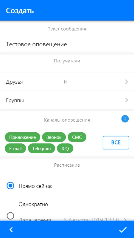 Программный комплекс предназначен для планирования и моментальной отправки сообщений по различным каналам связи, такими как: Голосовой вызов, СМС, Email, Telegram, ICQ, VIber, WhatsApp и другие. Комплекс работает как SaaS сервис и имеет отдельные приложения в Google Play и App Store.